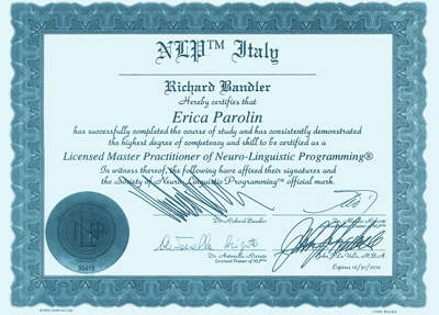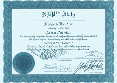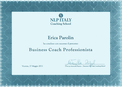 - Mi sono formata in PNL e Coaching presso NLP ITALY, dove ho conseguito la qualifica di Coach professionista (certificazione internazionale della society of NLP di Richard Bandler) con specializzazione in Business Coaching.